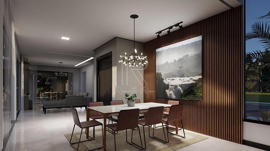 Apresentamos uma Casa Mobiliada no Condomínio Caledônia com 440 m² de área construída, que oferece espaços amplos e bem distribuídos. O imóvel possui uma suíte master com closet, banheira e chuveiro duplo, mais três suítes. O pé direito alto e a escadaria em granito adicionam elegância. A casa conta com sala, cozinha com espera para ilha, despensa, lareira, sala de jantar e sala de estar. A área gourmet possui churrasqueira a carvão. Também possui lavanderia, banheiro para área da piscina e aberturas em alumínio gold. A piscina tem prainha com 12,0x3,0m e 1,40m de profundidade, além de iluminação. Garagem coberta para 2 carros e 4 vagas descobertas.